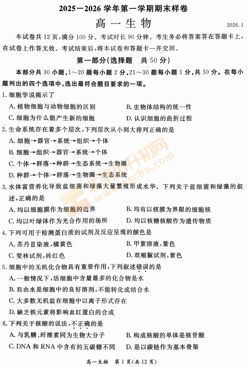 2025-2026学年(上)东城高一期末生物试卷已出炉!下载完整版试卷请点击文末pdf文件!或点击下方图片↓打包下载2026年北京各区高中期末试卷!
