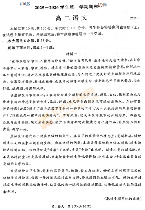 2025-2026学年(上)东城高二期末语文试卷已出炉!下载完整版试卷请点击文末pdf文件!或点击下方图片↓打包下载2026年北京各区高中期末试卷!