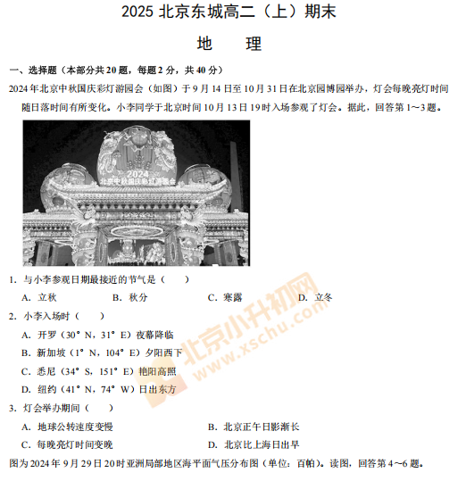 2025-2026学年(上)东城高二期末地理试卷及答案预计在2026年1月出炉!家长可先下载去年期末试题,练习提升!新试卷公布后将更新在本页面,建议(Ctrl+D)收藏本页面!