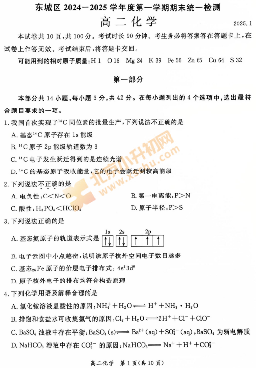 2025-2026学年(上)东城高二期末化学试卷及答案预计在2026年1月出炉!家长可先下载去年期末试题,练习提升!新试卷公布后将更新在本页面,建议(Ctrl+D)收藏本页面!