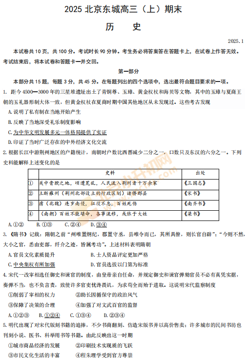 2025-2026学年(上)东城高三期末历史试卷及答案预计在2026年1月出炉!家长可先下载去年期末试题,练习提升!新试卷公布后将更新在本页面,建议(Ctrl+D)收藏本页面!