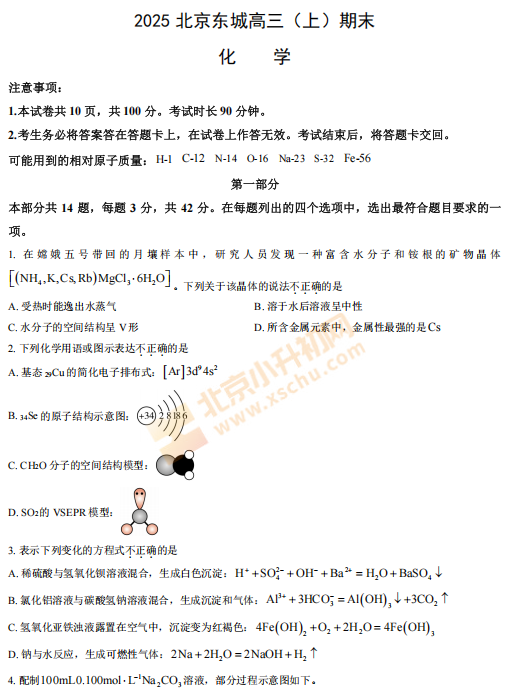 2025-2026学年第一学期东城高三期末化学试卷及答案什么时候出?考哪些内容?如何下载?