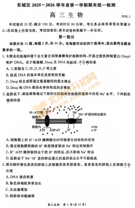 2025-2026学年(上)东城高三期末生物试卷及答案已出炉!下载完整版试卷请点击文末pdf文件!或点击下方图片↓打包下载2026年北京各区高中期末试卷!