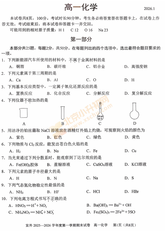 2025-2026学年第一学期西城高一期末化学试卷及答案什么时候出?考哪些内容?如何下载?