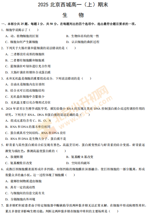 2025-2026学年(上)西城高一期末生物试卷及答案预计在2026年1月出炉!家长可先下载去年期末试题,练习提升!新试卷公布后将更新在本页面,建议(Ctrl+D)收藏本页面!