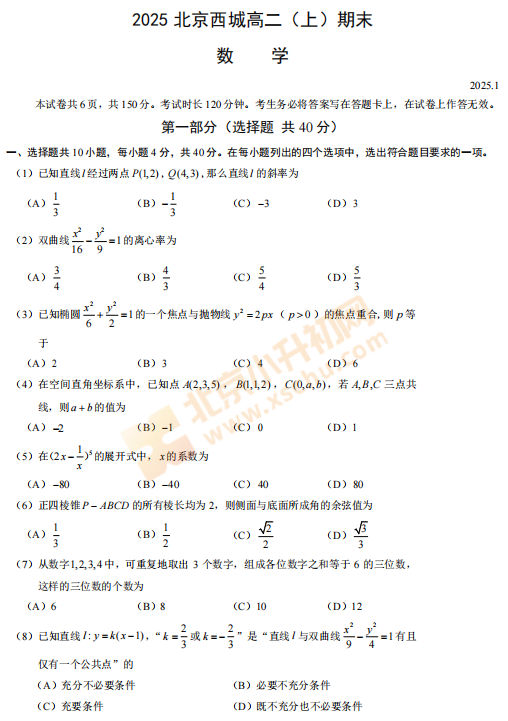 2025-2026学年(上)西城高二期末数学试卷及答案预计在2026年1月出炉!家长可先下载去年期末试题,练习提升!新试卷公布后将更新在本页面,建议(Ctrl+D)收藏本页面!