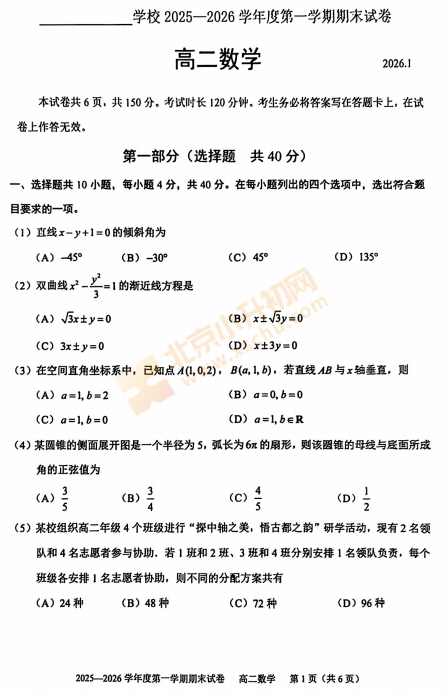 2025-2026学年(上)西城高二期末数学试卷及答案已出炉!下载完整版试卷请点击文末pdf文件!或点击下方图片↓打包下载2026年北京各区高中期末试卷!