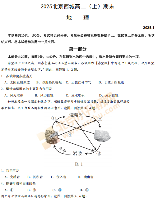 2025-2026学年(上)西城高二期末地理试卷及答案预计在2026年1月出炉!家长可先下载去年期末试题,练习提升!新试卷公布后将更新在本页面,建议(Ctrl+D)收藏本页面!
