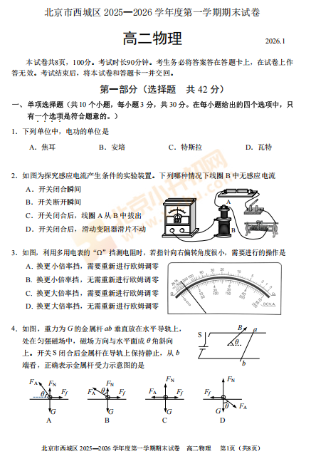 2025-2026学年(上)西城高二期末物理试卷已出炉!下载完整版试卷请点击文末pdf文件!或点击下方图片↓打包下载2026年北京各区高中期末试卷!