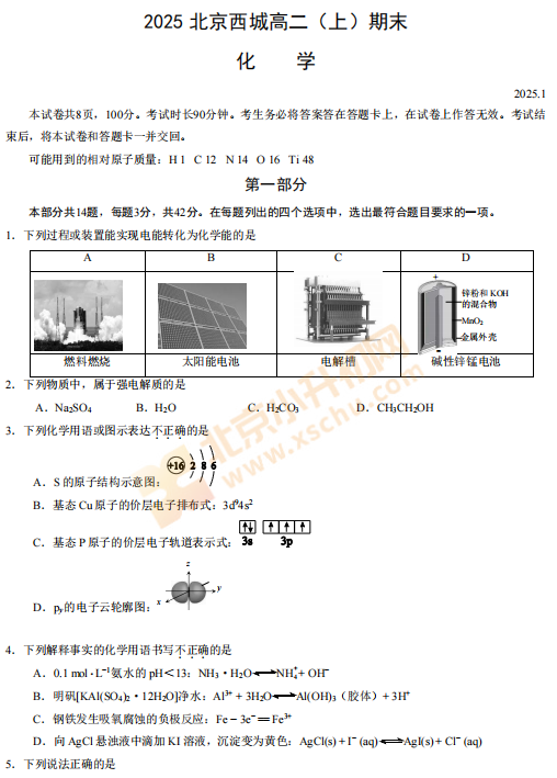 2025-2026学年(上)西城高二期末化学试卷及答案预计在2026年1月出炉!家长可先下载去年期末试题,练习提升!新试卷公布后将更新在本页面,建议(Ctrl+D)收藏本页面!