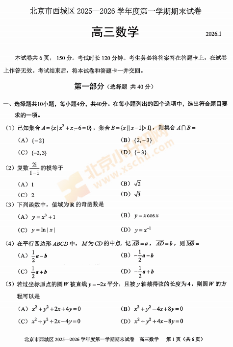 2025-2026学年第一学期西城高三期末数学试卷及答案什么时候出?考哪些内容?如何下载?