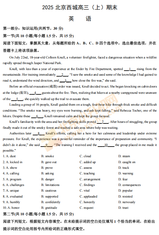 2025-2026学年(上)西城高三期末英语试卷及答案预计在2026年1月出炉!家长可先下载去年期末试题,练习提升!新试卷公布后将更新在本页面,建议(Ctrl+D)收藏本页面!