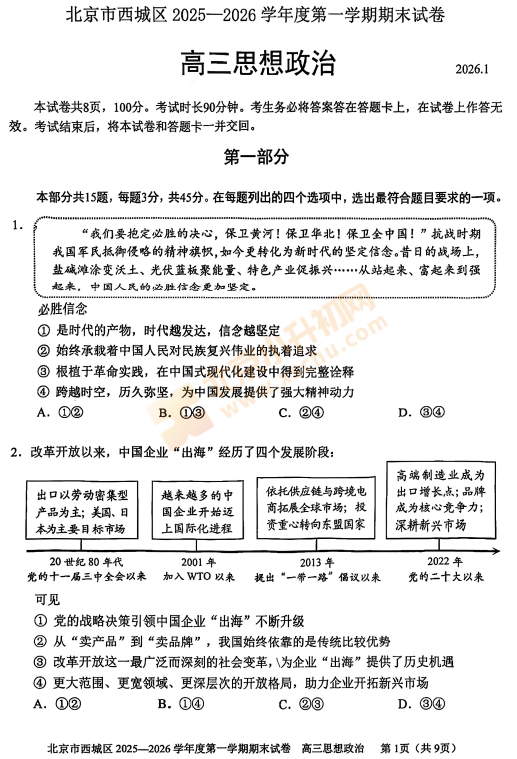 2025-2026学年(上)西城高三期末政治试卷已出炉!下载完整版试卷请点击文末pdf文件!或点击下方图片↓打包下载2026年北京各区高中期末试卷!