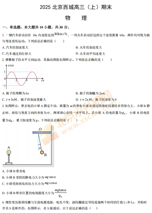 2025-2026学年第一学期西城高三期末物理试卷及答案什么时候出?考哪些内容?如何下载?