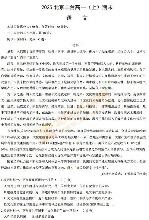 2025-2026学年(上)丰台高一期末语文试卷及答案预计在2026年1月出炉!家长可先下载去年期末试题,练习提升!新试卷公布后将更新在本页面,建议(Ctrl+D)收藏本页面!