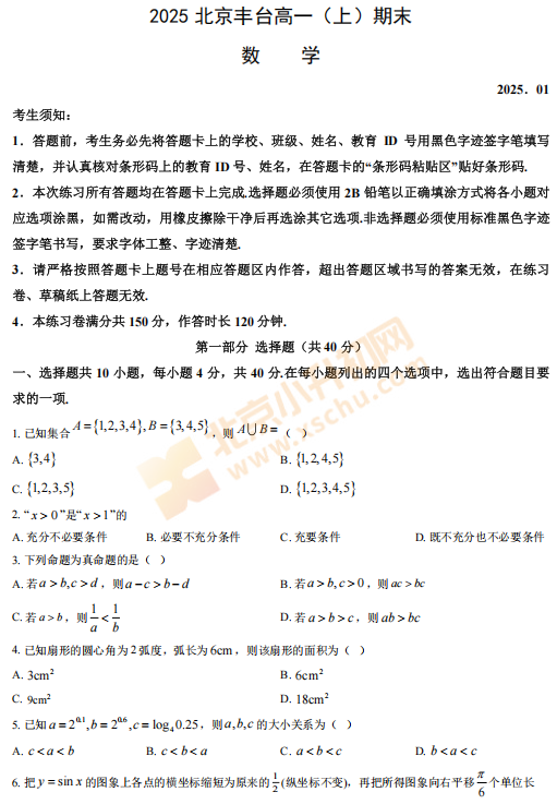 2025-2026学年(上)丰台高一期末数学试卷及答案预计在2026年1月出炉!家长可先下载去年期末试题,练习提升!新试卷公布后将更新在本页面,建议(Ctrl+D)收藏本页面!
