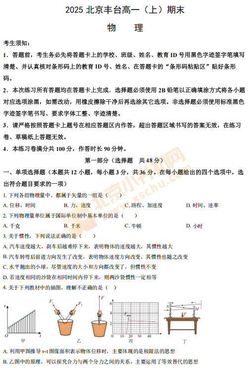 2025-2026学年(上)丰台高一期末物理试卷及答案预计在2026年1月出炉!家长可先下载去年期末试题,练习提升!新试卷公布后将更新在本页面,建议(Ctrl+D)收藏本页面!