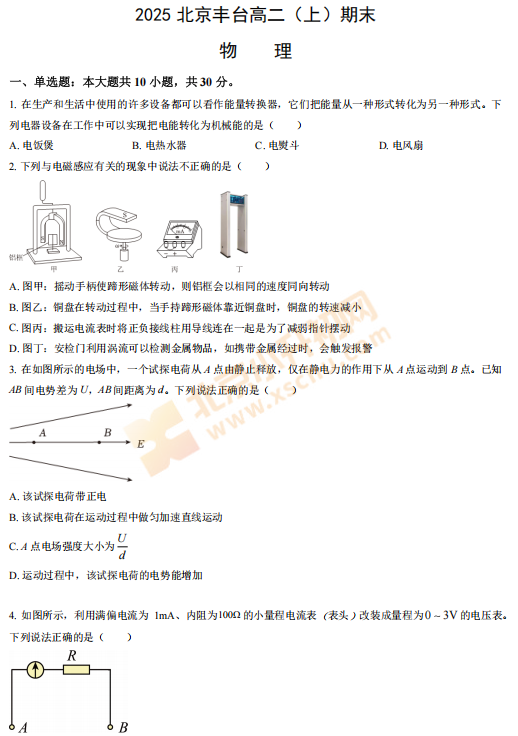 2025-2026学年(上)丰台高二期末物理试卷及答案预计在2026年1月出炉!家长可先下载去年期末试题,练习提升!新试卷公布后将更新在本页面,建议(Ctrl+D)收藏本页面!