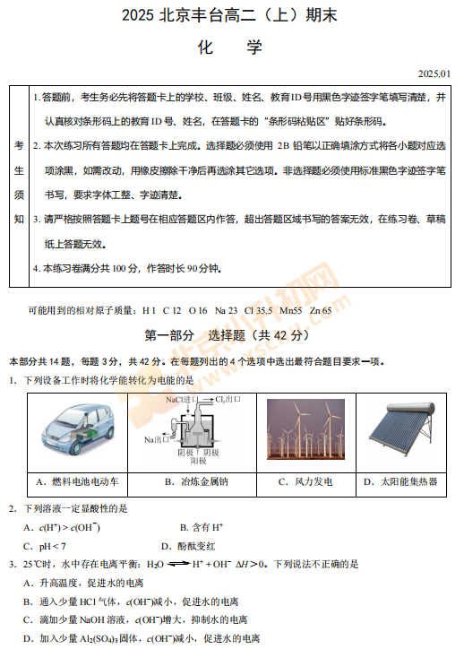 2025-2026学年(上)丰台高二期末化学试卷及答案预计在2026年1月出炉!家长可先下载去年期末试题,练习提升!新试卷公布后将更新在本页面,建议(Ctrl+D)收藏本页面!