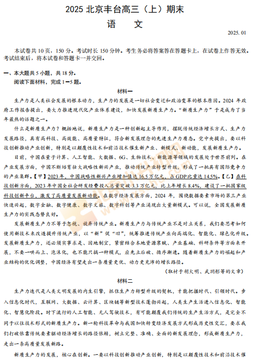 2025-2026学年(上)丰台高三期末语文试卷及答案预计在2026年1月出炉!家长可先下载去年期末试题,练习提升!新试卷公布后将更新在本页面,建议(Ctrl+D)收藏本页面!