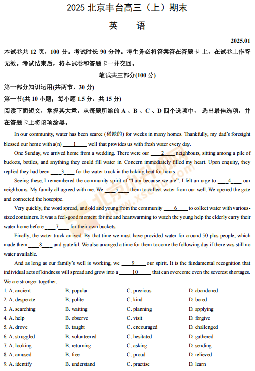 2025-2026学年(上)丰台高三期末英语试卷及答案预计在2026年1月出炉!家长可先下载去年期末试题,练习提升!新试卷公布后将更新在本页面,建议(Ctrl+D)收藏本页面!