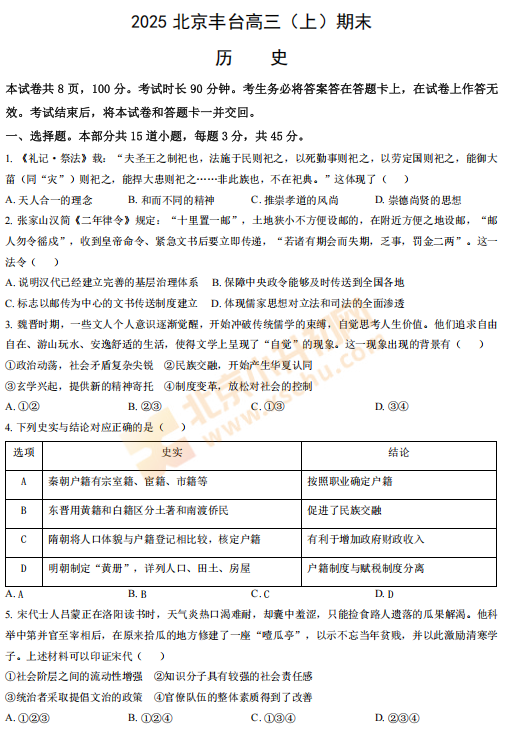 2025-2026学年(上)丰台高三期末历史试卷及答案预计在2026年1月出炉!家长可先下载去年期末试题,练习提升!新试卷公布后将更新在本页面,建议(Ctrl+D)收藏本页面!