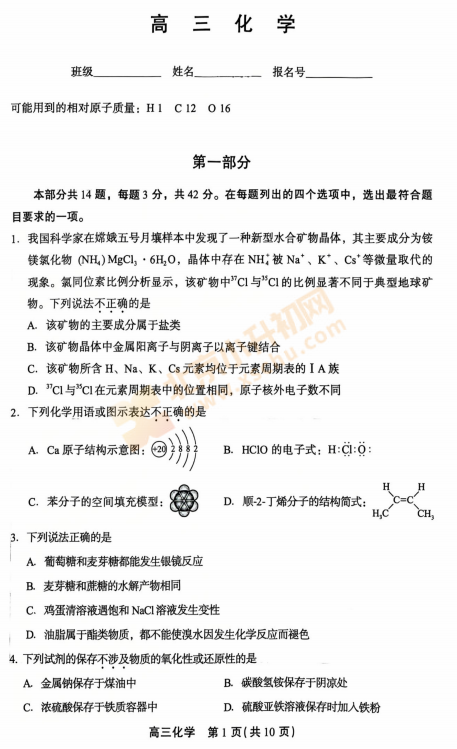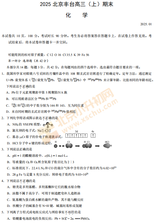 2025-2026学年第一学期丰台高三期末化学试卷及答案什么时候出?考哪些内容?如何下载?