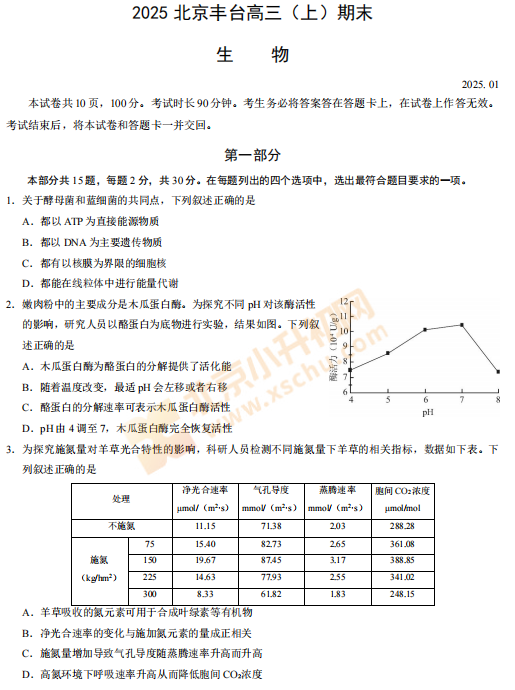 2025-2026学年(上)丰台高三期末生物试卷及答案预计在2026年1月出炉!家长可先下载去年期末试题,练习提升!新试卷公布后将更新在本页面,建议(Ctrl+D)收藏本页面!