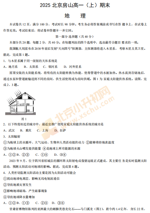 2025-2026学年(上)房山高一期末地理试卷及答案预计在2026年1月出炉!家长可先下载去年期末试题,练习提升!新试卷公布后将更新在本页面,建议(Ctrl+D)收藏本页面!