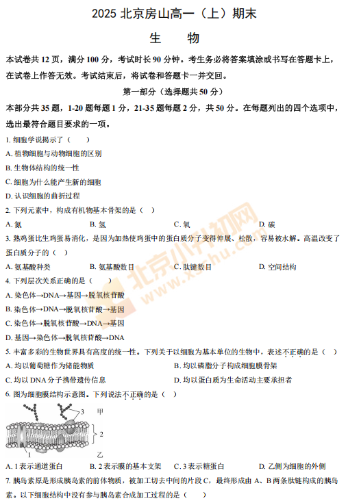 2025-2026学年(上)房山高一期末生物试卷及答案预计在2026年1月出炉!家长可先下载去年期末试题,练习提升!新试卷公布后将更新在本页面,建议(Ctrl+D)收藏本页面!