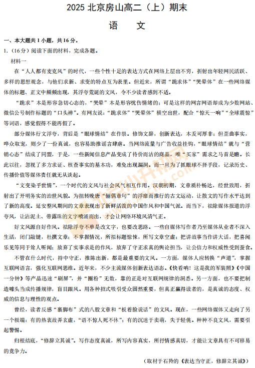 2025-2026学年第一学期房山高二期末语文试卷及答案什么时候出?考哪些内容?如何下载?