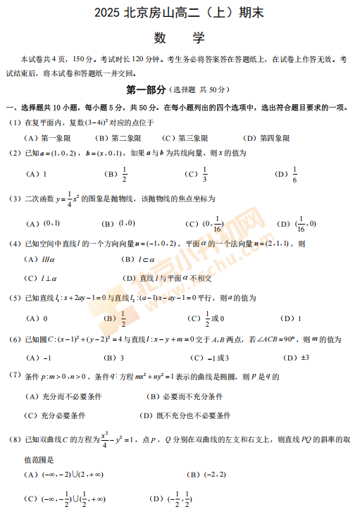 2025-2026学年第一学期房山高二期末数学试卷及答案什么时候出?考哪些内容?如何下载?