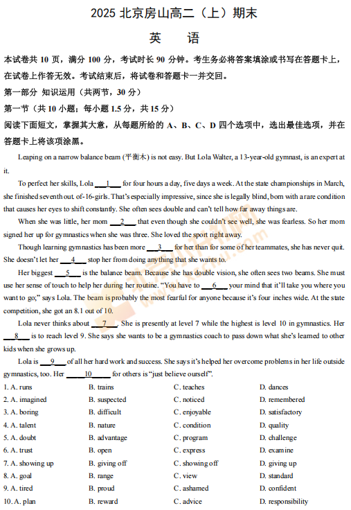 2025-2026学年(上)房山高二期末英语试卷及答案预计在2026年1月出炉!家长可先下载去年期末试题,练习提升!新试卷公布后将更新在本页面,建议(Ctrl+D)收藏本页面!