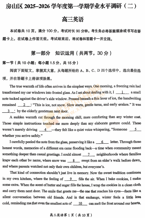 2025-2026学年(上)房山高三期末英语试卷已出炉!下载完整版试卷请点击文末pdf文件!或点击下方图片↓打包下载2026年北京各区高中期末试卷!