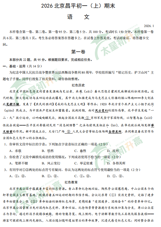 2025-2026学年第一学期昌平初一期末语文试卷及答案什么时候出?考哪些内容?如何下载?