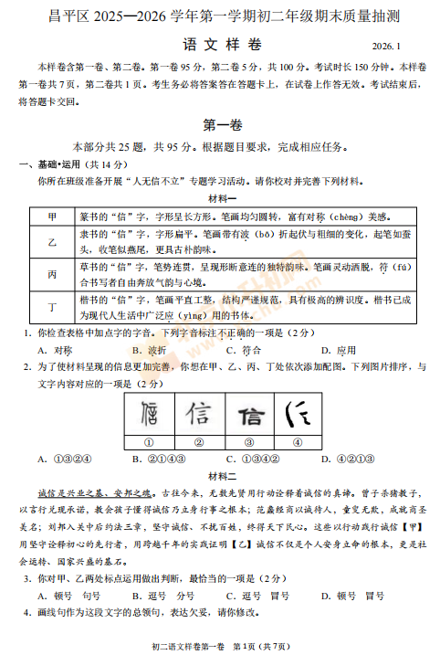 2025-2026学年第一学期昌平初二期末语文试卷及答案什么时候出?考哪些内容?如何下载?