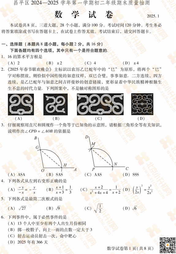 2025-2026学年(上)昌平初二期末数学试卷及答案预计在2026年1月出炉!家长可先下载去年期末试题,练习提升!新试卷公布后将更新在本页面,建议(Ctrl+D)收藏本页面!