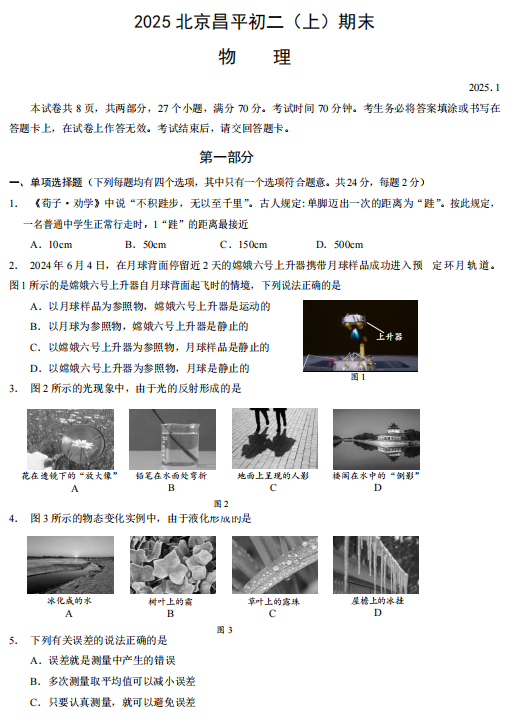 2025-2026学年第一学期昌平初二期末物理试卷及答案什么时候出?考哪些内容?如何下载?