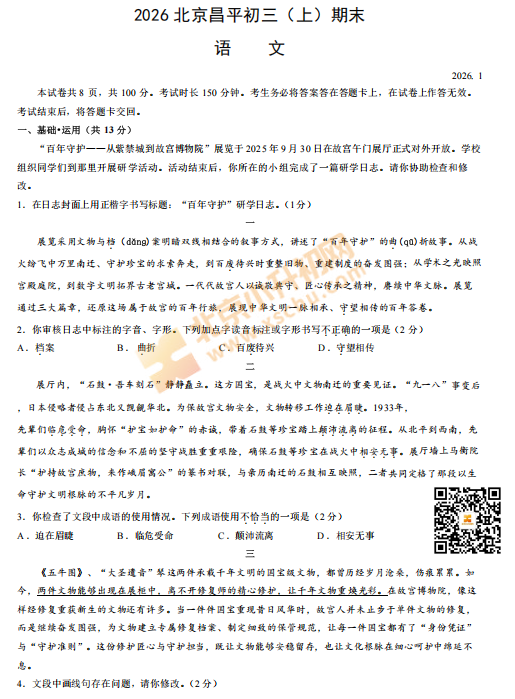 2026 北京昌平初三(上)期末语文