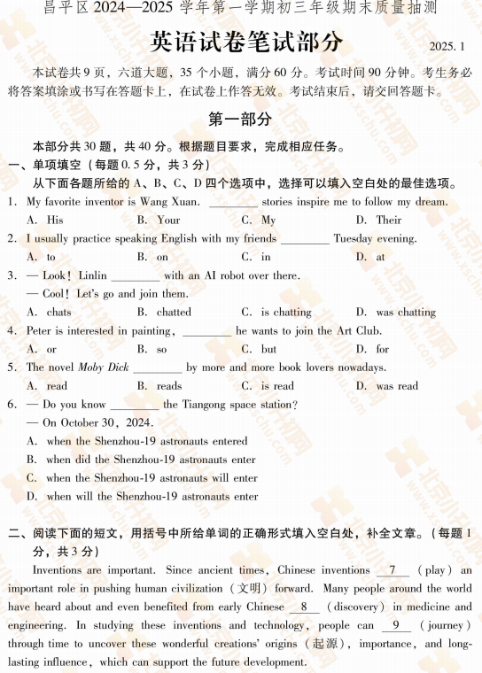 2025-2026学年(上)昌平初三期末英语试卷及答案预计在2026年1月出炉!家长可先下载去年期末试题,练习提升!新试卷公布后将更新在本页面,建议(Ctrl+D)收藏本页面!