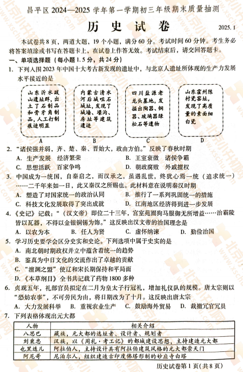 2025-2026学年(上)昌平初三期末历史试卷及答案预计在2026年1月出炉!家长可先下载去年期末试题,练习提升!新试卷公布后将更新在本页面,建议(Ctrl+D)收藏本页面!