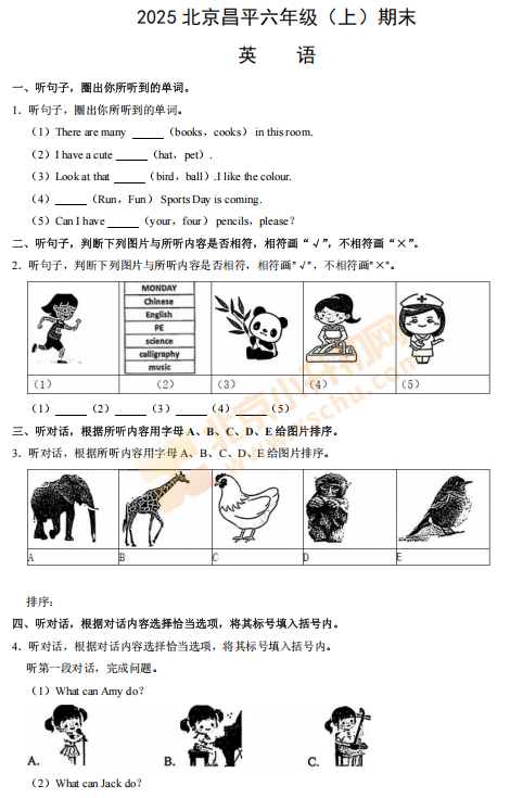 2025-2026学年(上)昌平区小学六年级英语期末试题预计在2026年1月出炉!家长可先下载去年期末试题,练习提升!新试卷公布后将更新在本页面,建议(Ctrl+D)收藏本页面!