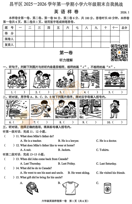 2025-2026学年(上)昌平区小学六年级英语期末试题已出炉!下载完整版试卷请点击文末pdf文件!或点击下方图片↓打包下载2026年北京各区小学期末试卷!