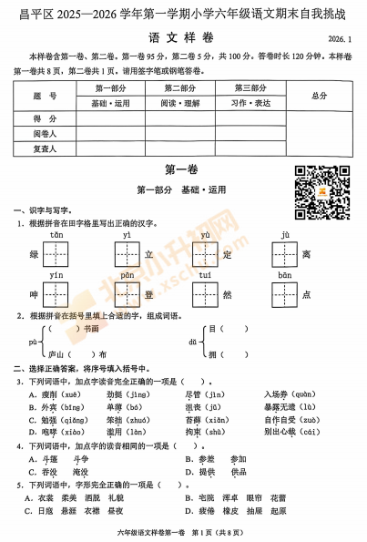 2025-2026学年(上)昌平区小学六年级语文期末试题已出炉!下载完整版试卷请点击文末pdf文件!或点击下方图片↓打包下载2026年北京各区小学期末试卷!