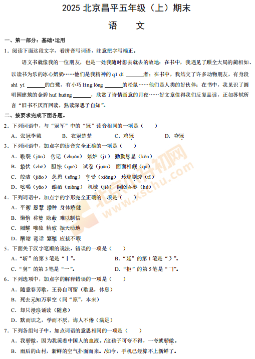 2025-2026学年(上)昌平区小学五年级语文期末试题预计在2026年1月出炉!家长可先下载去年期末试题,练习提升!新试卷公布后将更新在本页面,建议(Ctrl+D)收藏本页面!