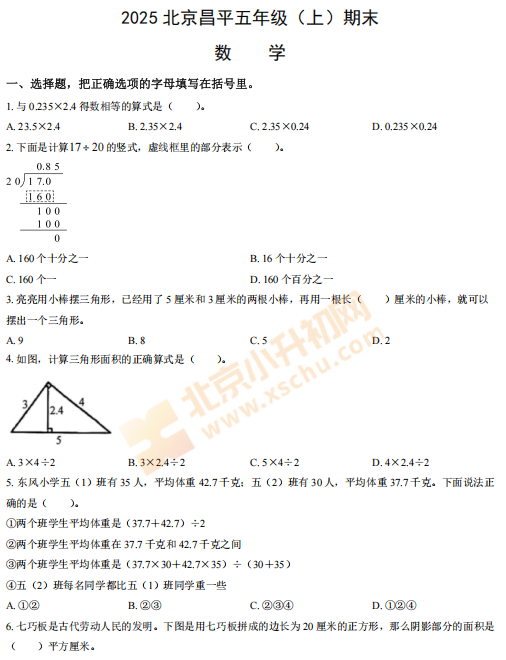 2025-2026学年(上)昌平区小学五年级数学期末试题预计在2026年1月出炉!家长可先下载去年期末试题,练习提升!新试卷公布后将更新在本页面,建议(Ctrl+D)收藏本页面!