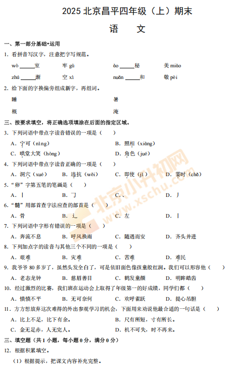 2025-2026学年(上)昌平区小学四年级语文期末试题预计在2026年1月出炉!家长可先下载去年期末试题,练习提升!新试卷公布后将更新在本页面,建议(Ctrl+D)收藏本页面!
