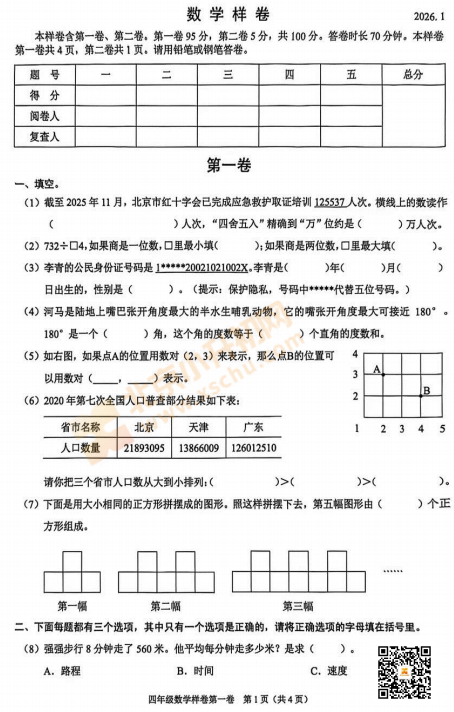 2025-2026学年(上)昌平区小学四年级数学期末试题及答案已出炉!下载完整版试卷请点击文末pdf文件!或点击下方图片↓打包下载2026年北京各区小学期末试卷!