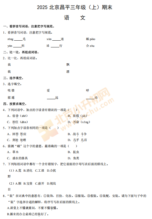 2025-2026学年(上)昌平区小学三年级语文期末试题预计在2026年1月出炉!家长可先下载去年期末试题,练习提升!新试卷公布后将更新在本页面,建议(Ctrl+D)收藏本页面!