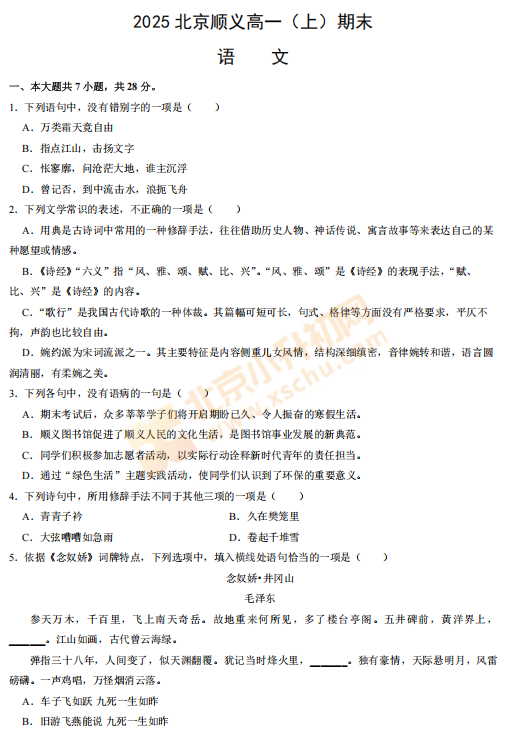 2025-2026学年第一学期顺义高一期末语文试卷及答案什么时候出?考哪些内容?如何下载?